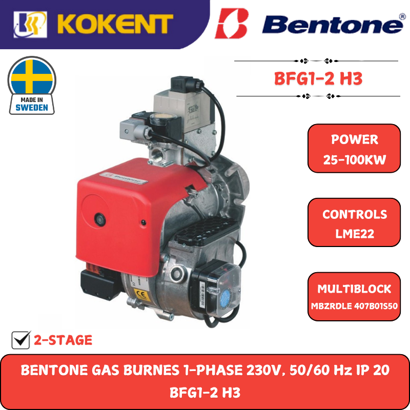 The Bentone BFG1-2 H3 is a two-stage industrial gas burner designed for boilers, dryers, and furnaces, available for LPG, natural gas, and biogas. It is energy-efficient, quiet, and reliable, with a two-stage operation that allows for both low and high-fire settings.