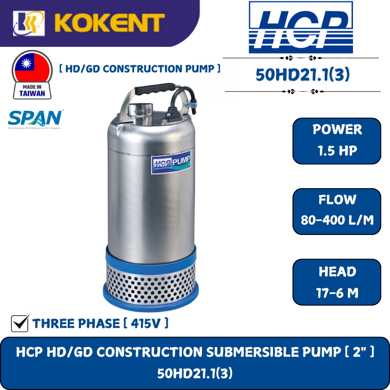 HCP 50HD21.1(3) (made in Taiwan) is a submersible dewatering pump for civil engineering, dewatering, tunnel, ground works, mining & manhole sewer.