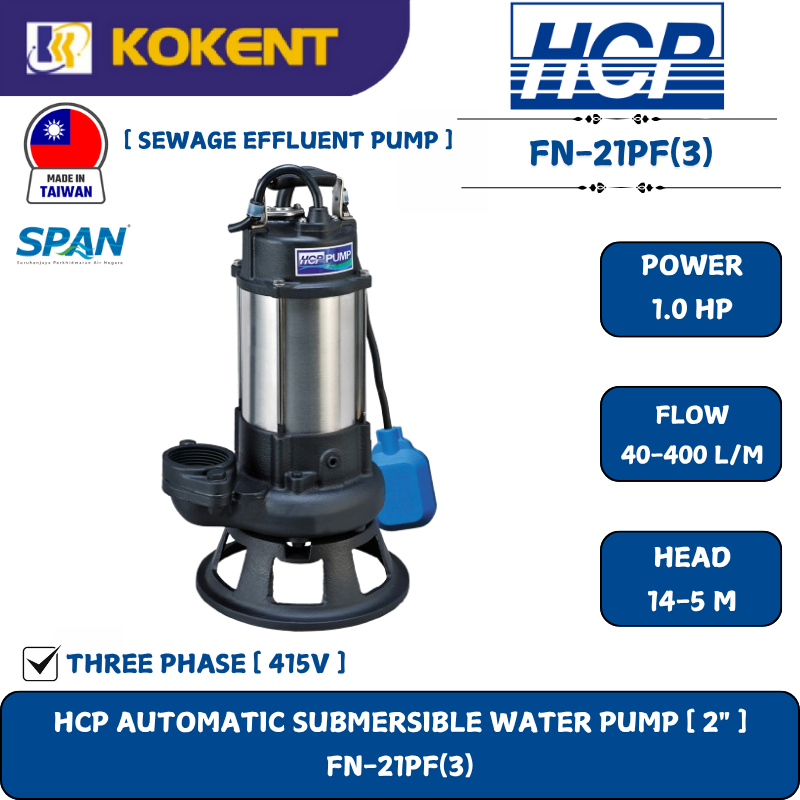 HCP MANUAL SUBMERSIBLE WATER PUMP [ 2".1HP.415V.40-400L/M.14-5M ] FN-21PF(3)