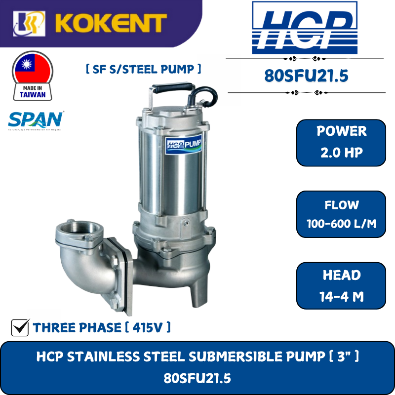 HCP STAINLESS STEEL SUBMERSIBLE PUMP [ 3".2HP.415V.100-600L/M.14-4M ] 80SFU21.5