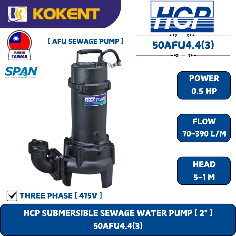 HCP SUBMERSIBLE SEWAGE WATER PUMP [ 2".0.5HP.415V.70-390L/M.5-1M ] 50AFU4.4(3)