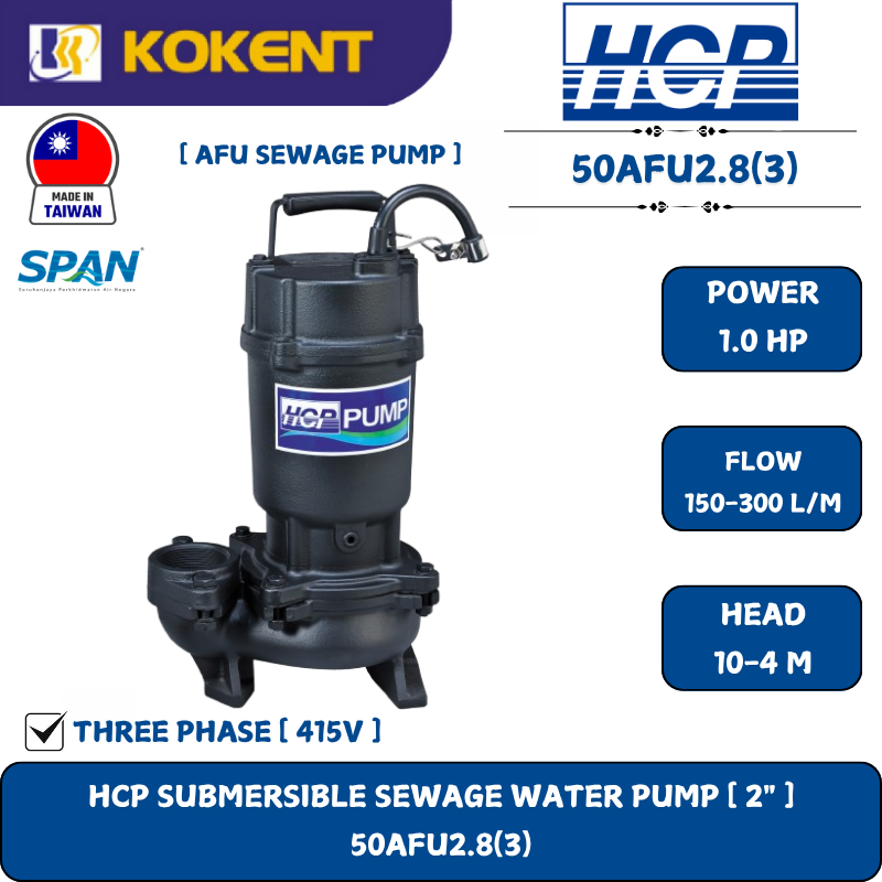 HCP SUBMERSIBLE SEWAGE WATER PUMP [ 2"1HP.415V.150-300L/M.10-4M ] 50AFU2.8(3)