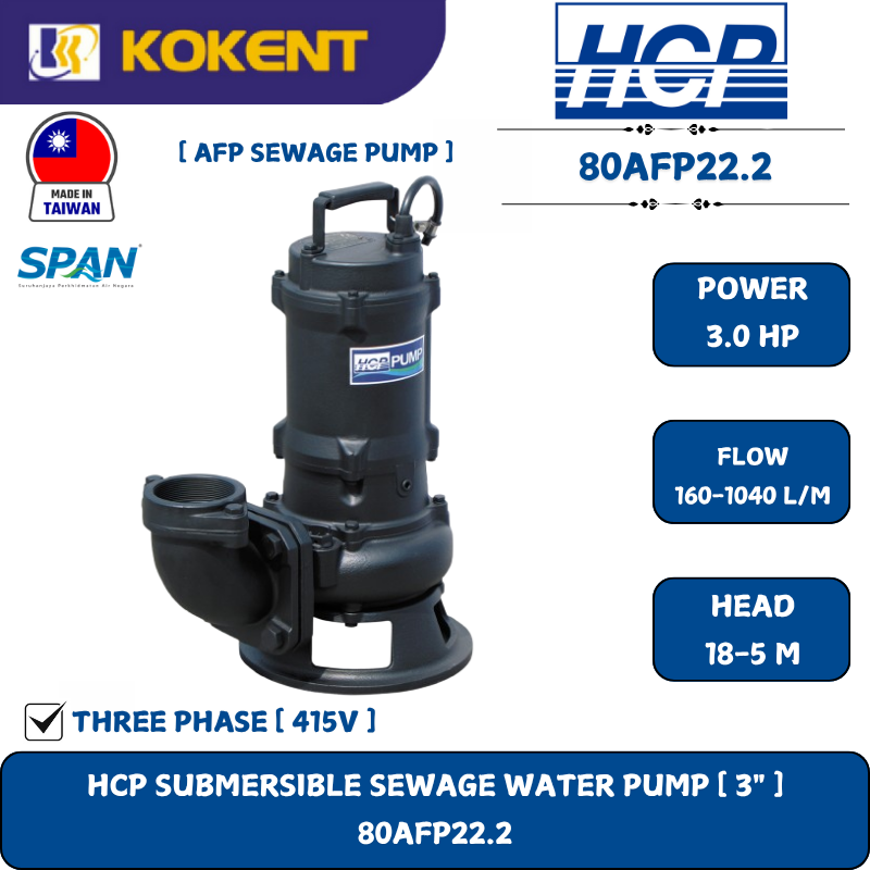 HCP SUBMERSIBLE SEWAGE WATER PUMP [ 3"3HP.415V.160-1040L/M.18-5M ] 80AFP22.2