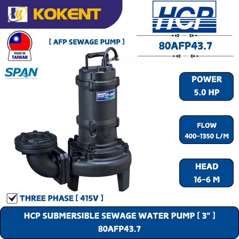 HCP SUBMERSIBLE SEWAGE WATER PUMP [ 3".5HP.415V.400-1350L/M.16-6M ] 80AFP43.7