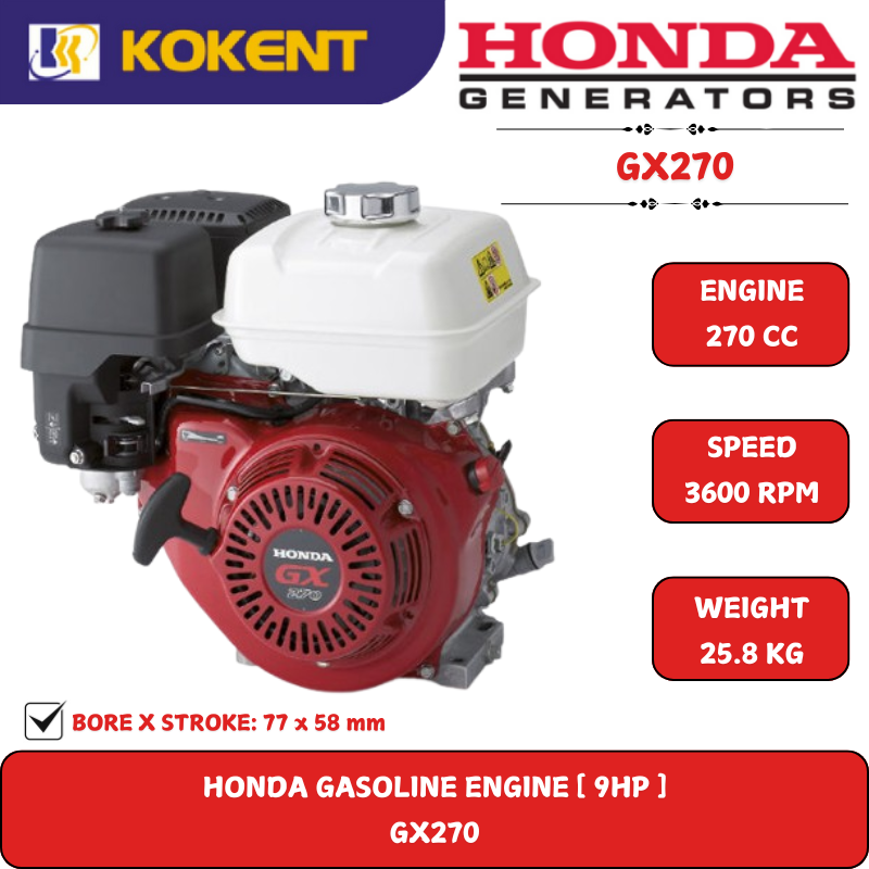 The GX270 engine is suitable for a wide range of heavy-duty applications such as construction equipment, tillers, generators, welders, pumps and other industrial applications.