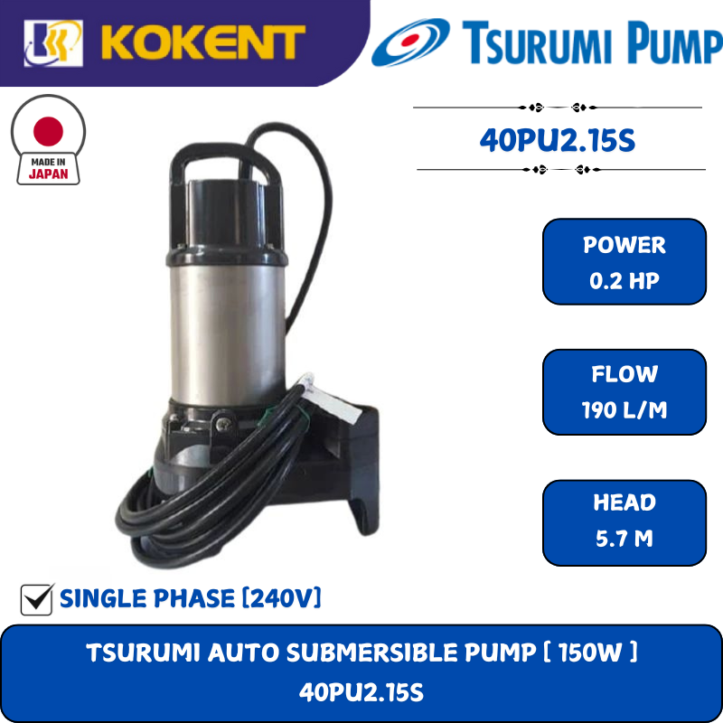 TSURUMI MANUAL SUBMERSIBLE WATER PUMP (2")(150W,0.2HP,240V,5.7M/H - 190L/MIN) 40PU2.15S